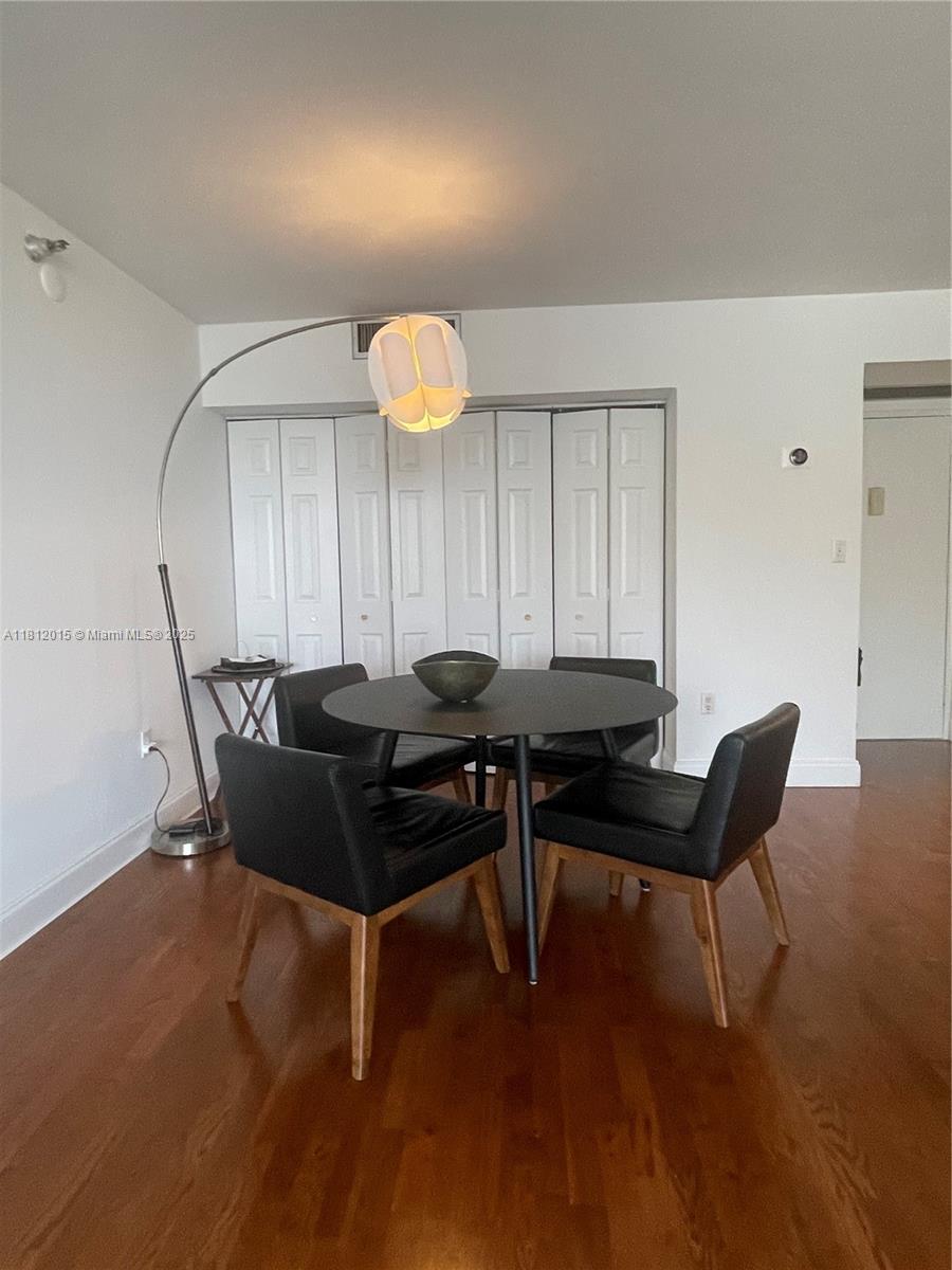 Stylish and spacious furnished condo (2/2) featuring an open floor plan, elegant parquet wood flooring, and a private balcony. The primary bedroom includes a convenient built-in desk.